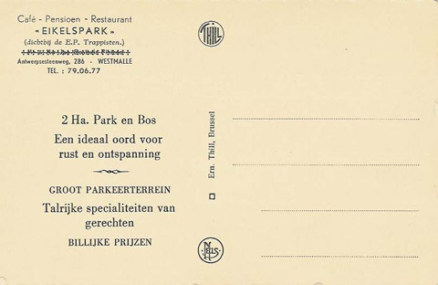 Café - Restaurant Eikelspark dat vroeger een gewone villa was en eigendom was van de familie Waterkeyn. Zicht in de tuin. |